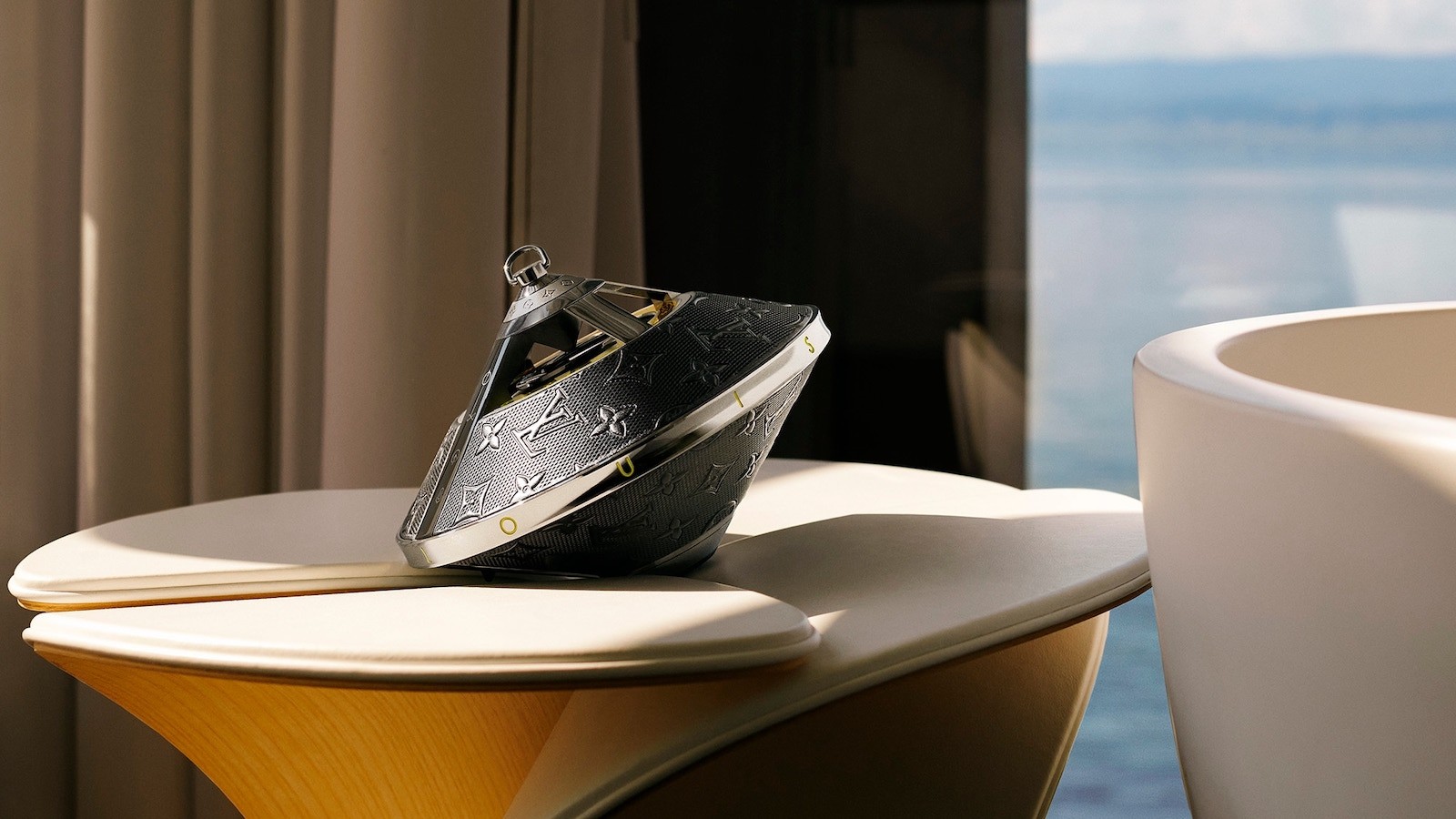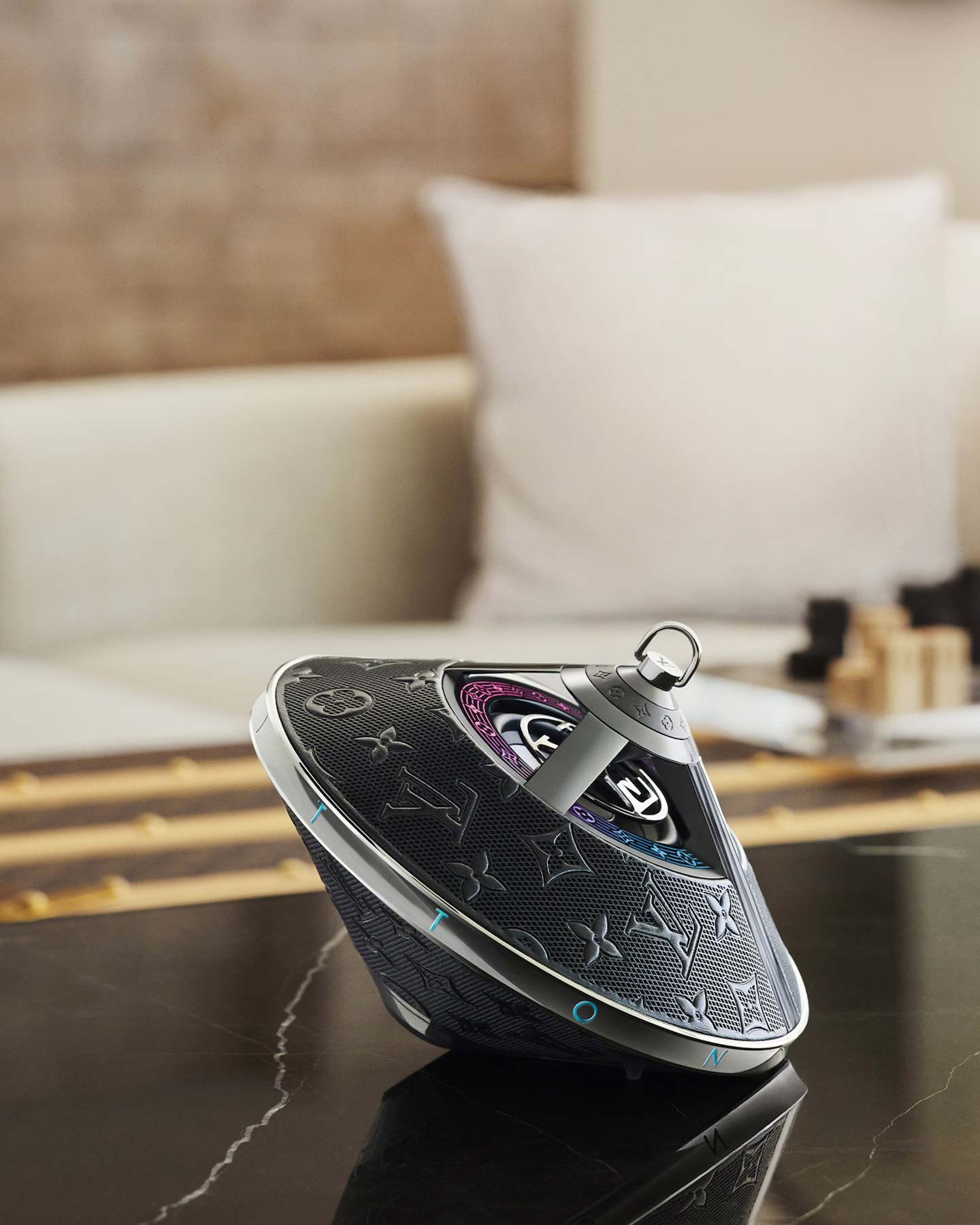 A collaboration with Louis Vuitton to create a portable speaker inspired by the Toupie handbag — a musical art piece crafted in metal and premium leather with 360° sound.