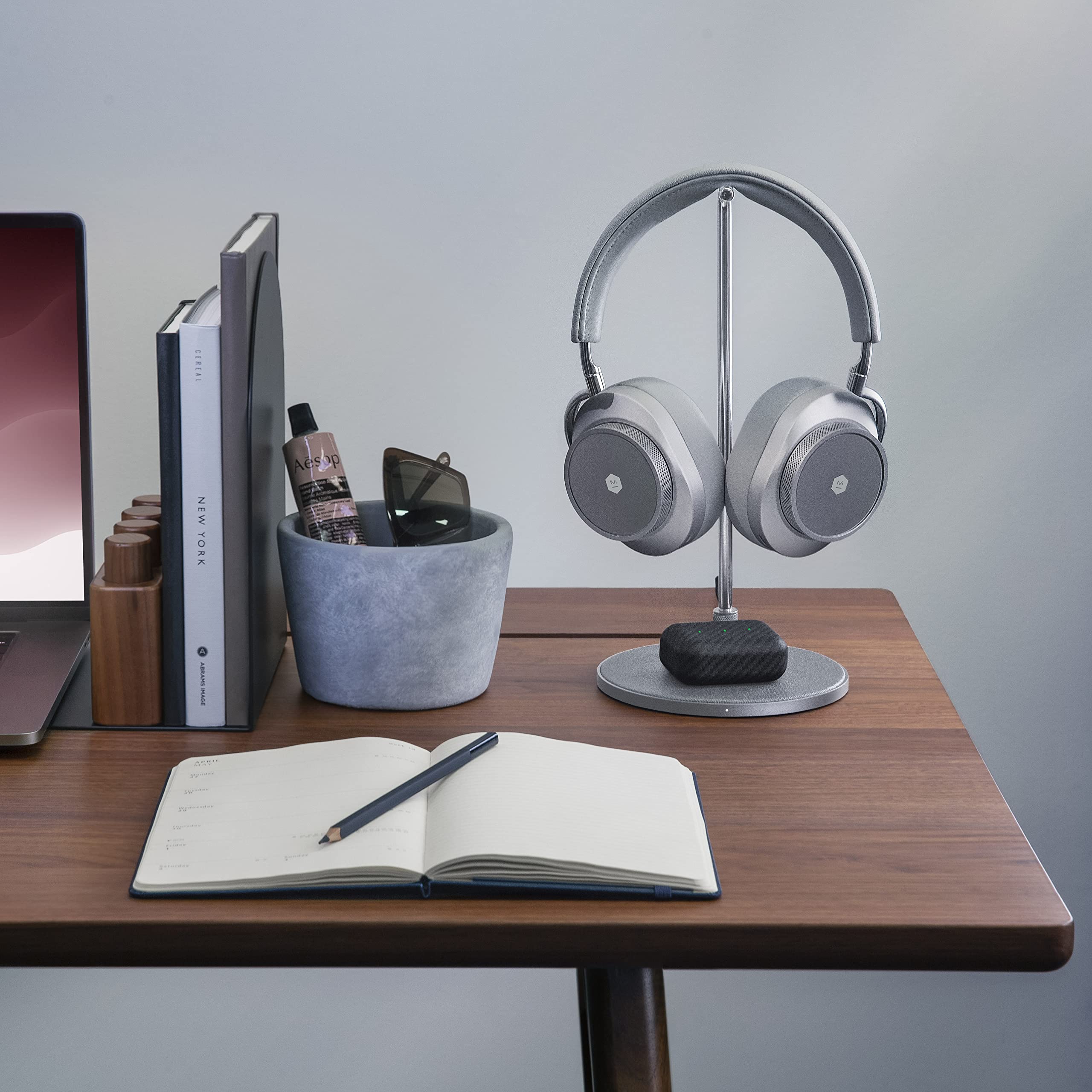 The MC300 — a 2-in-1 wireless charging pad and headphone stand that brings the same material precision and minimalist design language of M&D's audio products to your desktop.